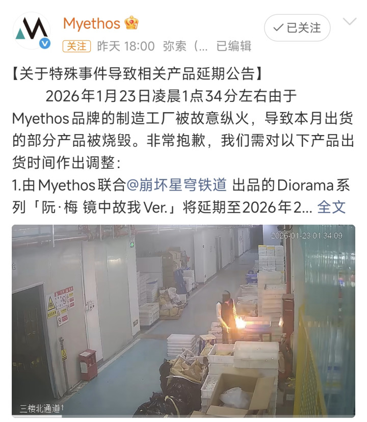 但就在2026年1月23日凌晨一点三十四分,MYETHOS厂家被人恶意纵火,导致了本将在本月出货的一批手办被烧毁。